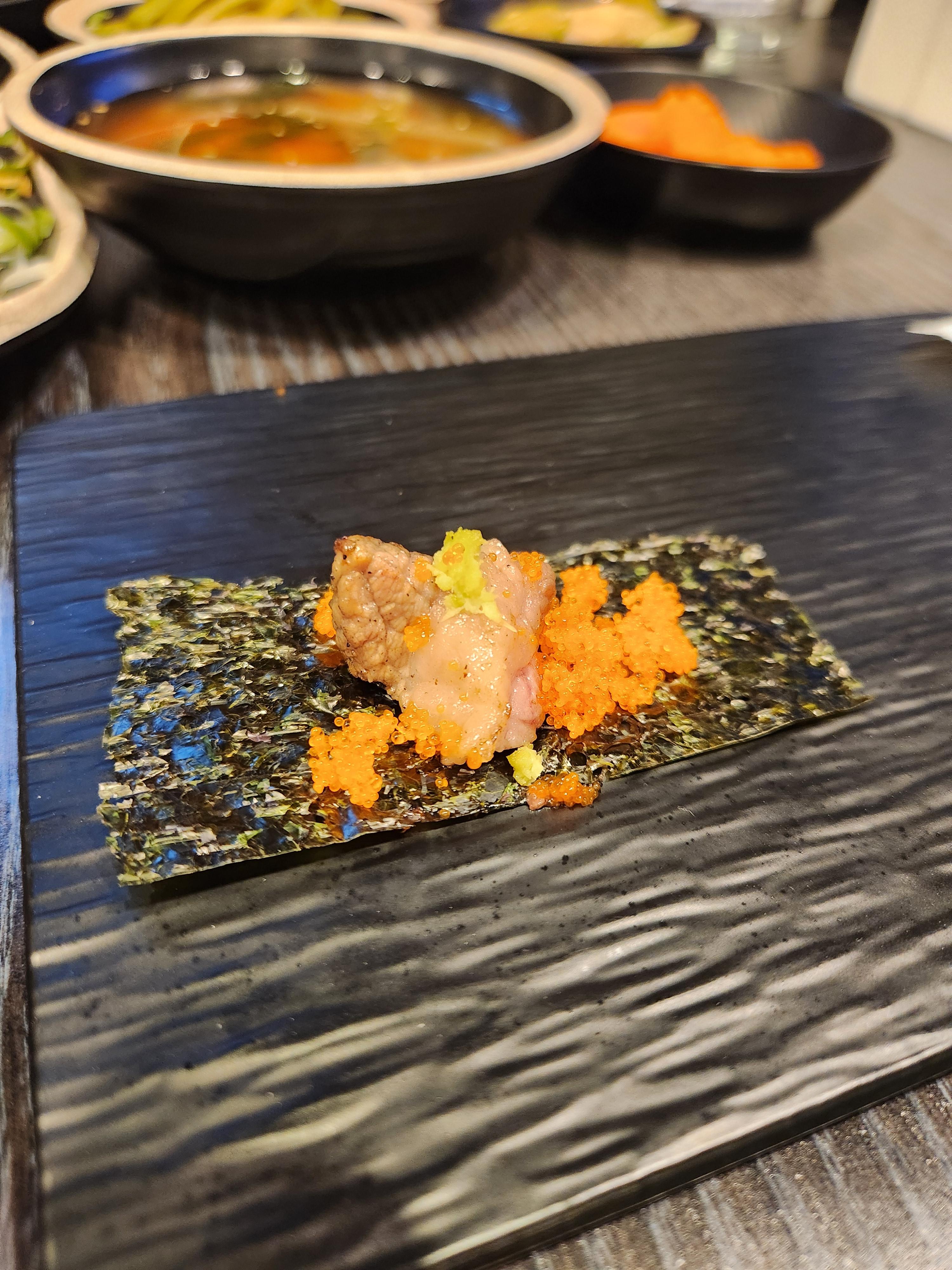 특이하게 김에 날치알 올려서 먹어보라고 하셔서 한입