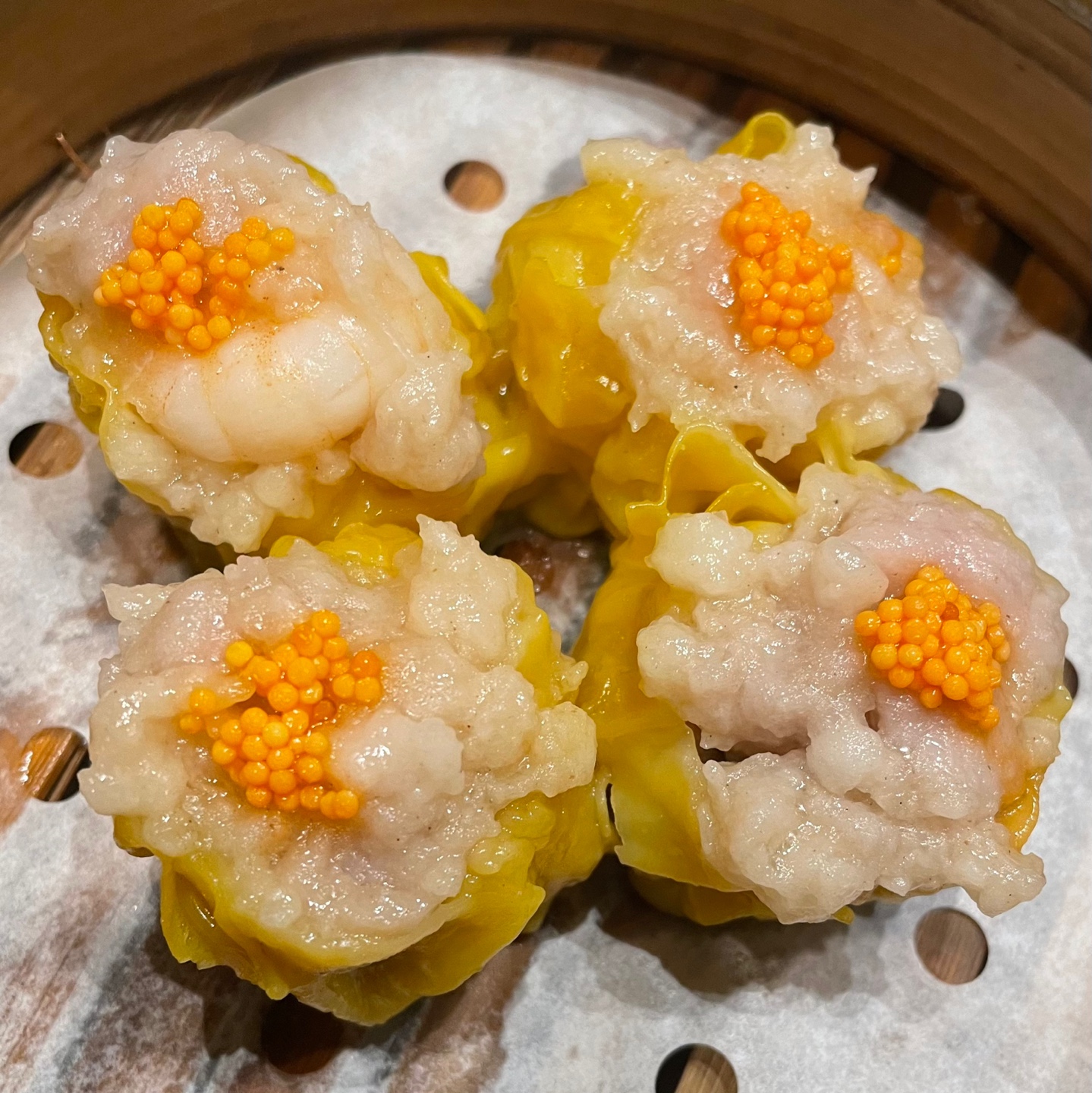 (Shrimp and pork dumplings with flying fish roe, Shu Mai)